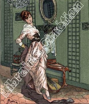 Pochoir en couleurs pour la Gazette du Bon Ton N°12, octobre 1913, planche II, montre une jeune femme en robe rose se détournant du miroir pour se faire admirer par son soupirant ; autour, plusieurs accessoires pour le théâtre, un luth, une mappemonde, un masque de comédie...