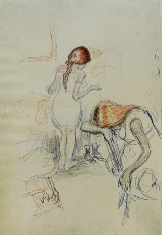 Louis Legrand (1863-1951), élève de Félicien Rops, s'attache à un sujet très en vogue à la fin du XIXe siècle, les coulisses du monde de la danse et du spectacle, joint à celui de la toilette. Le représentant le plus prolixe de ces sujets est Edgard Degas, qui s'appuie sur le développement des salles de spectacle au Second Empire. La danse est alors vue sous un angle sociologique et moderne, détaché de la mythologie. Après lui, Henri de Toulouse-Lautrec reprendra le thème des plaisirs nocturnes et du corps féminin traité de manière crue, mais non sans tendresse. Louis Legrand se montre un fin observateur de ses contemporains ; les deux jeunes filles, traitées de dos, sont saisies dans un moment intime, rendu plus doux par le choix de la technique. Infimes plis, légères brunissures marginales.