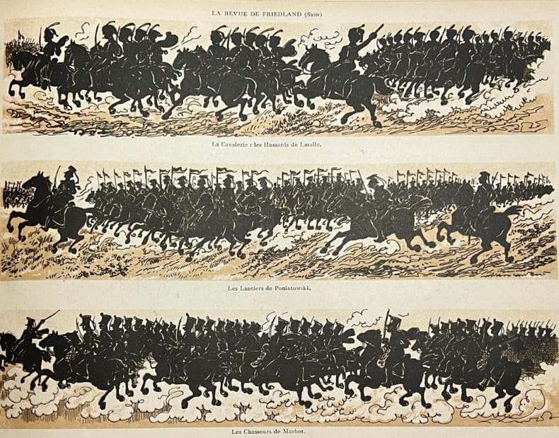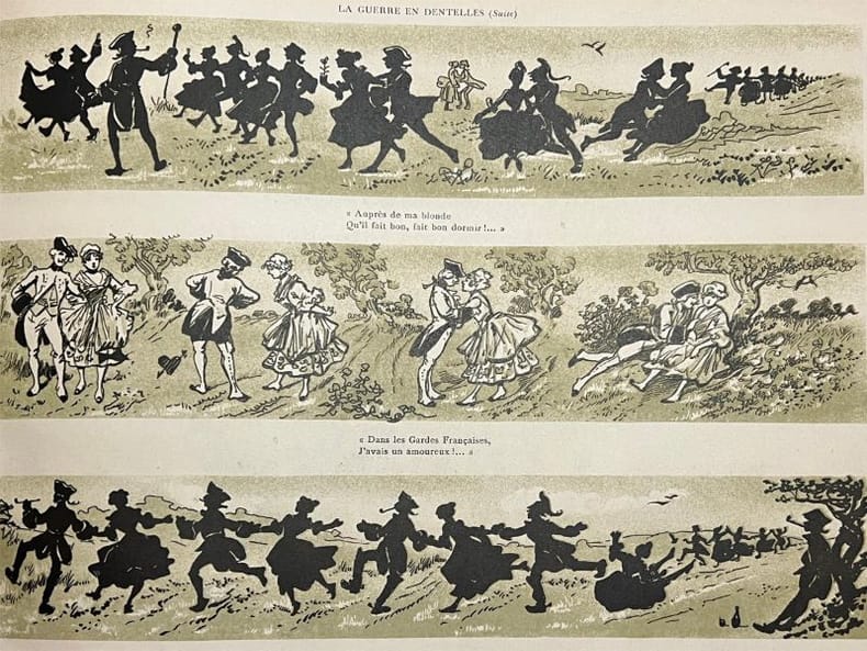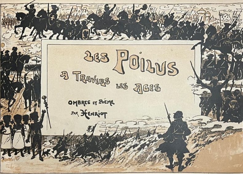 "Cet album reproduit la série de projections sur verre qui, au cours de la guerre, ont été données avec tant de succès, soit au front, pour amuser les Poilus, soit pour propagande patriotique en Hollande ou en Amérique, soit dans la plupart des camps de nos prisonniers en Suisse, pour les réconforter, soit à Paris et dans toutes les grandes villes de France, au profit des oeuvres de guerre et de secours aux blessés." La maison des Films Silf utilisa ce théâtre d'ombres pour des projections (Prospectus joint). Usures et salissures à la couverture, brochage interne fragile, petites piqures.