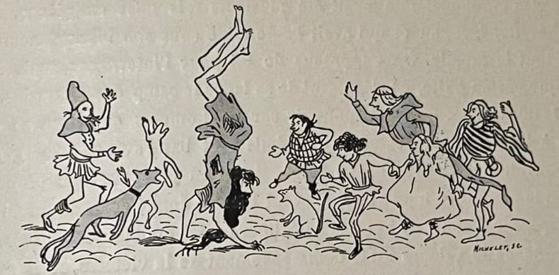 Cartonnage de percaline grise souris estampée d'une grande composition en couleurs et argent, Chevalier sur sa monture chargeant et embrochant lance en avant, des têtes humaines. 48 pages illustrées en noir et 6 planches en couleurs. Cahiers partiellement déréglés, rousseurs au dos de la feuille de garde.