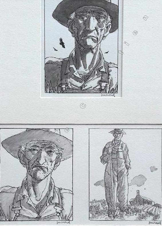 André JUILLARD, illustrateur, dessinateur et scénariste de bandes-dessinées, (1948-2024) est un adepte de la "ligne-claire". Nous présentons 3 dessins préparatoires à l'illustration de "Tandis que j'agonise" d'après Faulkner, chez Futuropolis-Gallimard, dont le dessin de la couverture représentant Anse, le patriarche.