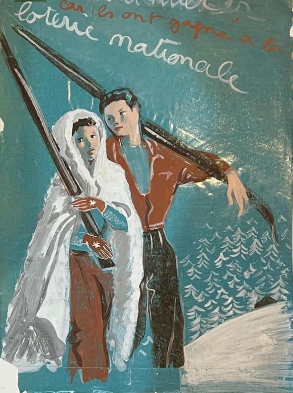 Marianne Clouzot (Le Vésinet 1908- Niort 2007), artiste aux talents multiples, présente dans un paysage enneigé, un skieur tenant amoureusement sa compagne. Maquette d'affiche pour la Loterie Nationale. Manque de papier et déchirures.