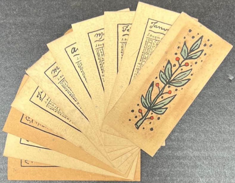 1917 Calendrier cartonné colorié au pochoir et signé en bas à gauche, (1917), 25 x 20.5 cm., encadrement central ajouré laissant apparaître le calendrier des mois de l'année, il est orné d'une cocarde tricolore en tissu.