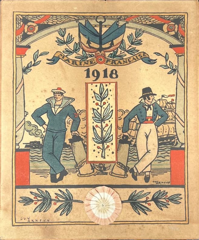 Les mois de l'année sont flanquées de deux marins, l'un XVIIIe et l'autre contemporain XXe, sur fond de navire de ces deux époques. Petites usures, piqures et marques au dos de papier collant, cocarde insolée, manque 2 mois de l'année. Guy Arnoux (1886-1951), Peintre Officiel de la Marine, dessinateur et coloriste prestigieux, "a crée toute une imagerie française singulièrement moderne et originale..." (Dico Solo). Tirage limité à 150 exemplaires.