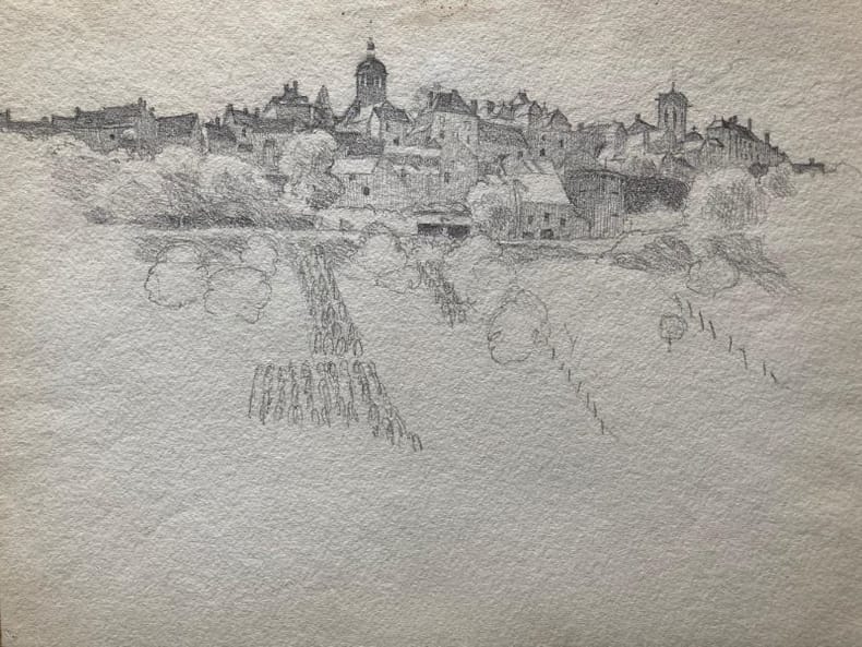 Dessin préparatoire représentant Vézelay et sa basilique qui domine. Tache marginale.