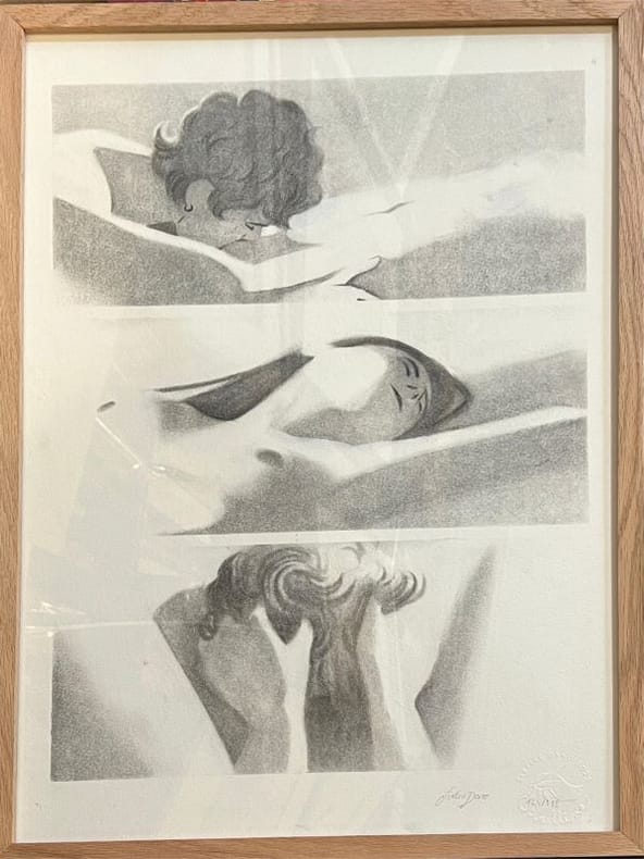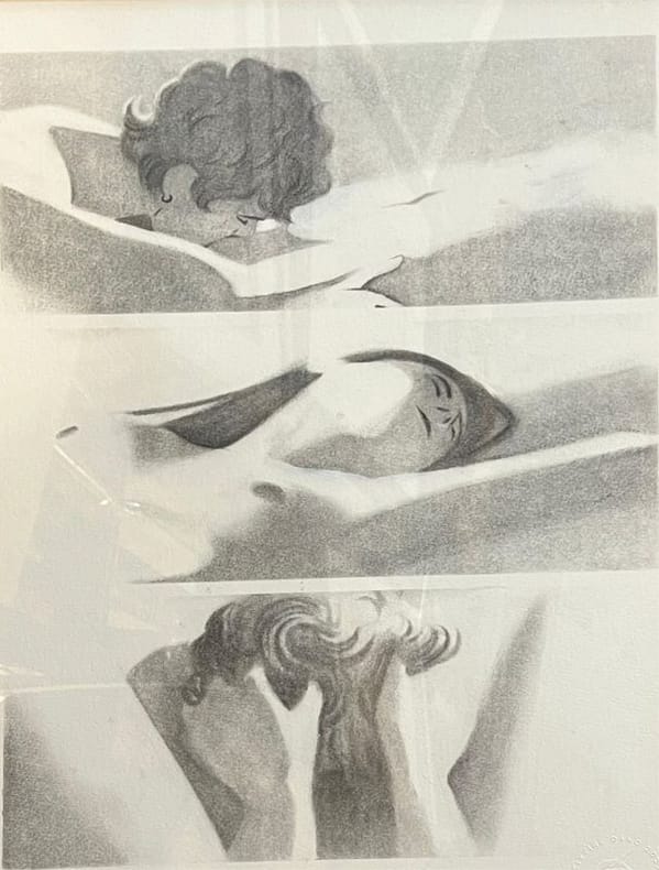 Oeuvre originale de Sixtine Dano pour son livre BD "Sibylline ..." , page 179, son premier roman graphique, Éditions Glénat, Pop Women sélection, in-4, 2025. Une exposition à la Galerie Michel Lagarde et une présetation à succès au Festival d'Angoulême saluèrent le talent de cette jeune artiste, diplômée d'un Master de cinéma, .