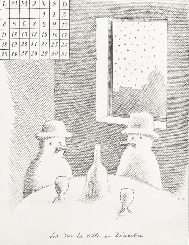 Pierre Le-Tan (Neuilly 1950-2019), artiste fin et discret, est l'illustrateur fétiche de Modiano. Ses créations pour le Salon du Dessin, les publicités pour Gucci, les Galeries Lafayette, Chanel ... sont immédiatement reconnaissables avec leurs fines hachures, leurs ombres au trait subtil. Ami d'Alain Lachartre Pierre Le Tan participe fréquemment à ses éditions publicitaires de luxe dont ce calendrier 2000.