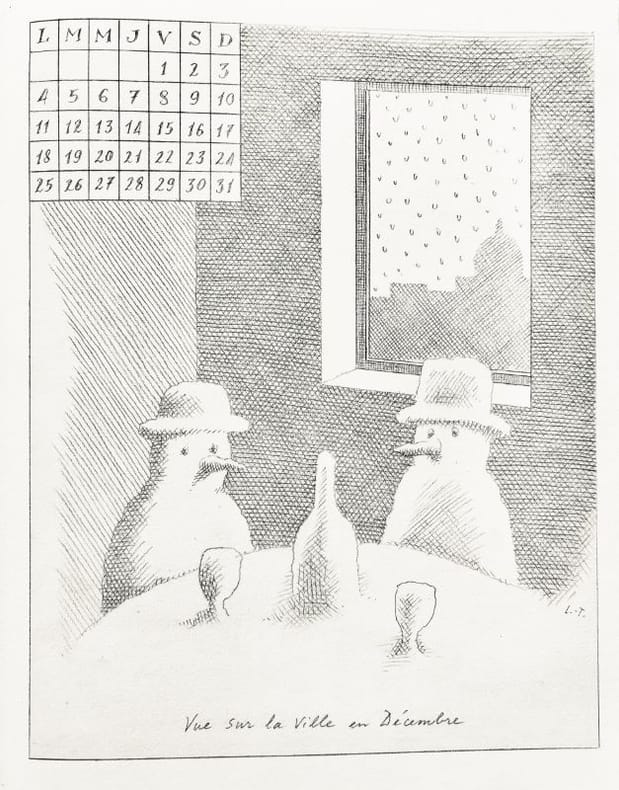 Pierre Le Tan (Neuilly 1950-2019), artiste fin et discret, est l'illustrateur fétiche de Modiano. Ses créations pour le Salon du Dessin, les publicités pour Gucci, les Galeries Lafayette, Chanel ... sont immédiatement reconnaissables avec leurs fines hachures, leurs ombres au trait subtil. Ami d'Alain Lachartre Pierre Le Tan participe fréquemment à ses éditions publicitaires de luxe dont ce calendrier 2000.