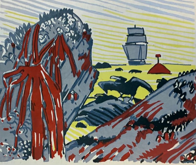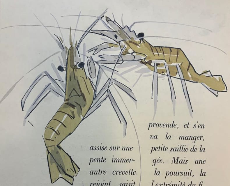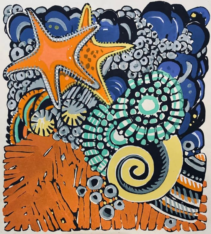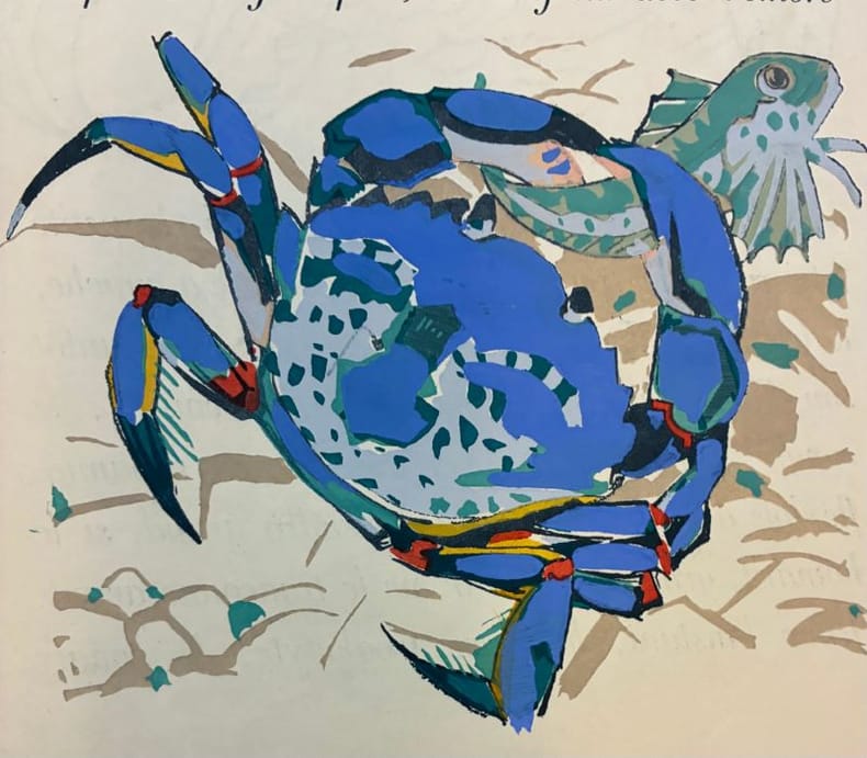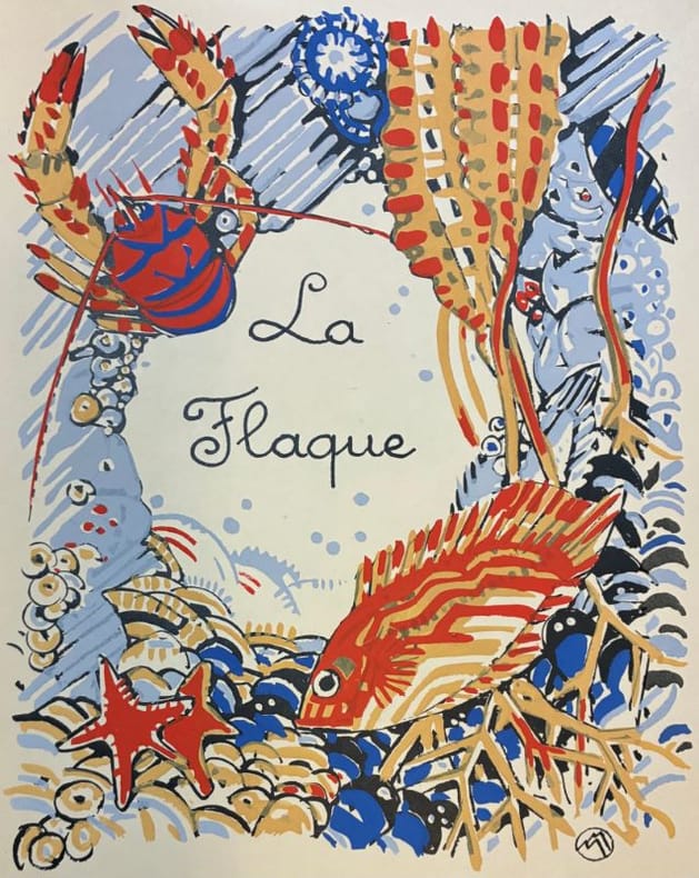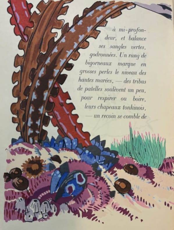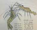 Mathurin Méheut ( Lamballe 1882-1958 Paris) est un artiste aux multiples talents. Tour à tour peintre, décorateur, illustrateur et céramiste. Elève de l'Ecole de Beaux-Arts de Rennes, obtint la bourse dite "Tour du Monde" (Sorbonne), et sera professeur après la Première guerre mondiale. En 1921 il devient Peintre Officiel de la Marine et dès lors décorera de nombreux paquebots. En 1926 il adhére à la Société des Artistes Décorateurs et à la Société de la Gravure Originale sur bois. Il participe à l'Exposition des Arts Décoratifs de 1925, à L'Exposition Coloniale de 1931 et à l'Exposition Internationale de 1937. Des expositions lui seront consacrées au Pavillon de Marsan (1913-22), à la Galerie Charpentier en 1931 et 1955. Il publia plusieurs ouvrages spécialisés sur l'étude la mer, de la faune et de la flore. Il illustra de nombreux livres de Genevoix, Dorgelès, Loti... Un musée lui est consacré à Lamballe. (Edouard Joseph T.III, 14 Bénézit T.VII, 305). Magnifique texte de Colette qui commence ainsi "Regarder, c'est apprendre ..." qui nous emporte à la découverte du monde marin et de ses occupants. Mathurin Méheut était le plus qualifié, en tant que Peintre de la Marine, pour enluminer une telle oeuvre qui est unanimement considérée comme son chef-d'oeuvre et l'un des monuments bibliophilique de l'Art-déco. Infime pli au pied marginal. Exemplaire d'artiste sur Japon Impérial d'un tirage justifié de 20 exemplaires.