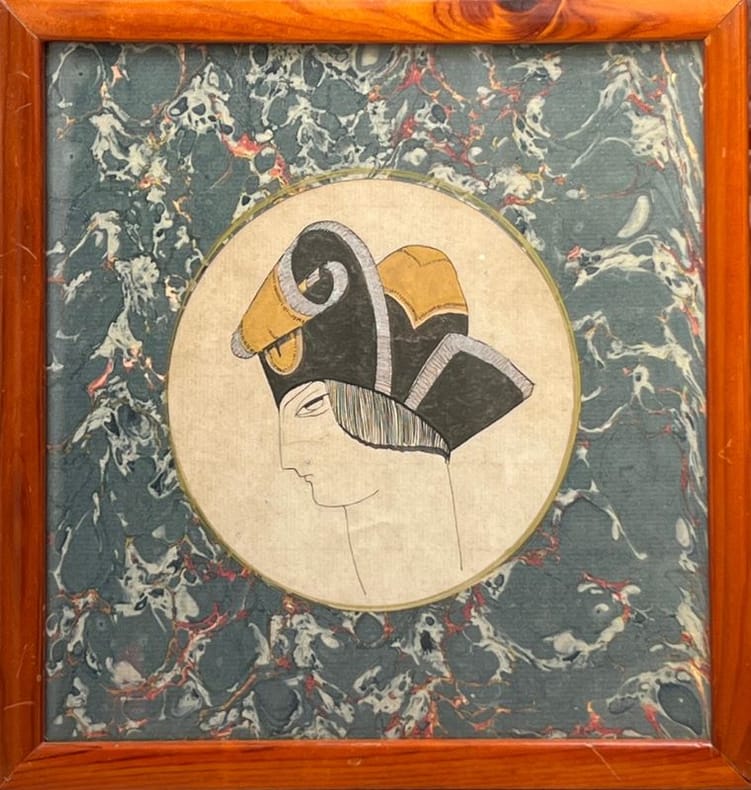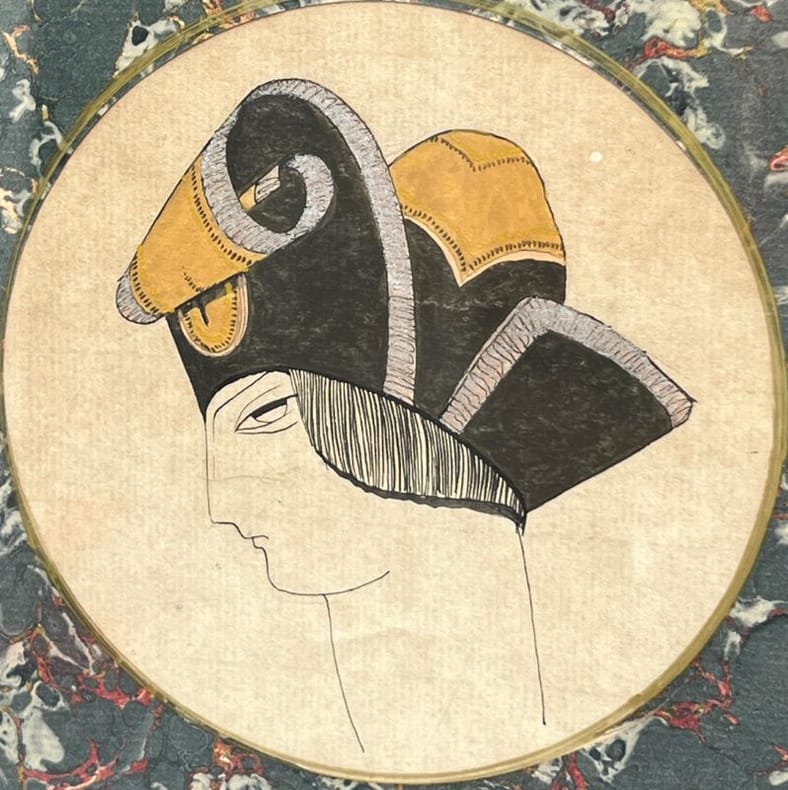 Maquette originale de la styliste attitrée de Paul Poiret, Madeleine Panizon. Les chapeaux de Madeleine Panizon mettaient en valeur les robes des grands couturiers et relevaient le chic de la parisienne. "La modiste Madeleine Panizon, de son vrai nom Madeleine Buisset, est installée dans les années 1920, rue de Ponthieu à Paris. Si elle apparaît peu dans la presse du temps, elle est pourtant une créatrice parisienne de renom particulièrement audacieuse et inventive. Elle propose à sa clientèle, notamment à la marquise de Lubersac, des chapeaux dune grande originalité, des casques ornés de glands de passementerie, de broderies ou encore de boutons dargent. En 1925, elle présente ses créations à lExposition Internationale des Arts Décoratifs et Industriels Modernes et remporte le prix dhonneur avec un capuchon dautomobiliste ou daviateur. Preuve de la renommée de cette modiste, Paul Poiret fait appel à elle pour créer les coiffures devant accompagner ses robes lorsquil ferme son atelier de chapeaux au début des années 1920" (in palaisgalliera.paris.fr).