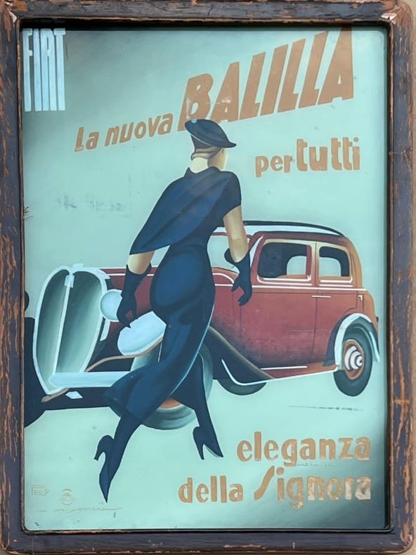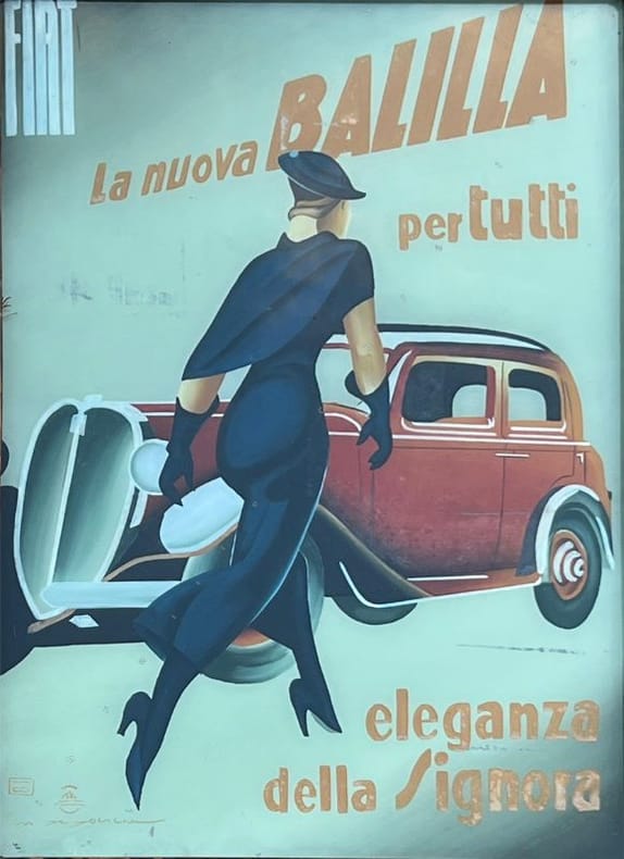 La Fiat 508 Balilla était une voiture destinée au peuple,qui proposait des éléments "Haut de gamme". Le talent de Marcello Dudovich fut de proposer une publicité qui allie chic et élégance. Colorée, cette affiche présente une jeune femme élancée, moderne et émancipée qui n'hésite pas à s'affranchir des conventions, en se montrant de dos. Marcello Dudovich (1878-1962) artiste italien, affichiste, peintre et illustrateur, est considéré comme l'un des maîtres de l'affiche en Italie. Il réalisa plus de 1.000 affiches publicitaires et reçut de nombreuses récompenses. Petites marques internes et griffures.