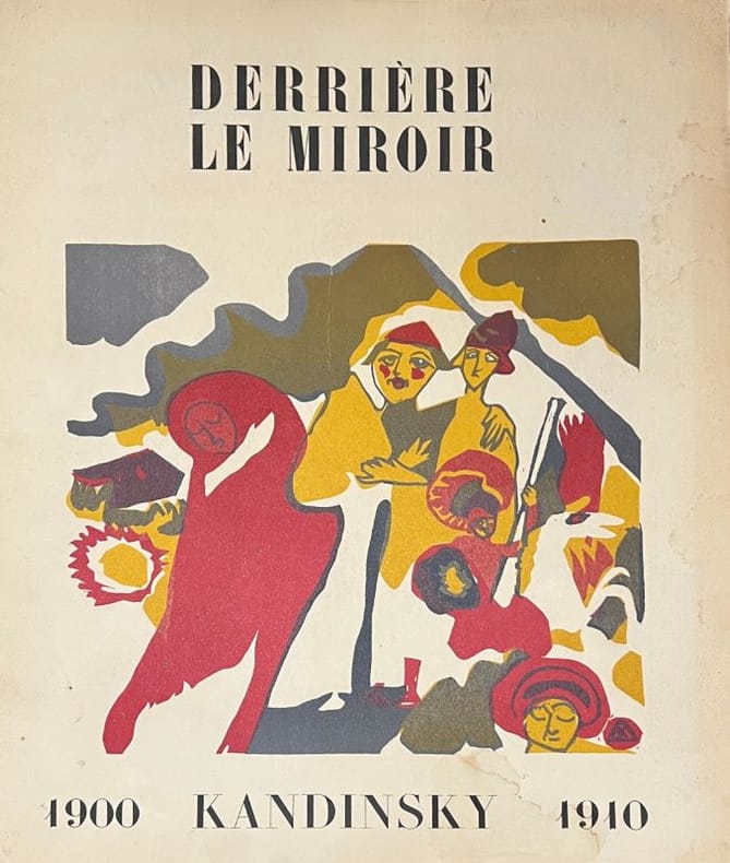 Derrière le Miroir est une revue artistique et littéraire qui réunissait essentiellement, des articles et des lithographies originales, pour la plupart en couleurs, des artistes qui travaillent principalement avec la galerie Maeght. Aimé Maeght est à l'initiative de cette revue qui fut conçue presque au même moment que l'ouverture de sa galerie parisienne (octobre 1945). Ce numéro de D.L.M.est consacré aux 10 premières années de peinture de Kandinsky et fait écho à l'exposition de ses oeuvres à la galerie Maeght. Il est accompagné d'un texte de Kandinsky "Regard sur le passé" écrit en 1913. 3 bois gravés sur bois en couleurs, 9 reproductions en noir illustrent ce numéro. Infimes usures et taches.