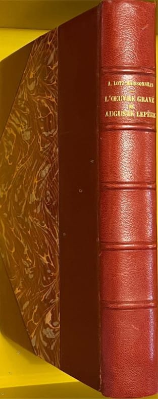 Catalogue descriptif et analytique orné de 5 gravures originales -dont une eau-forte numérotée sur Japon en frontispice et de 15 reproductions hors texte, avec une préface de Léon Bénédite conservateur du musée national du Luxembourg. Ce catalogue recense et décrit l'oeuvre gravé à l'eau-forte, lithographié, bois, livres, publications diverses d'Auguste Lepère considéré comme le "rénovateur" de la gravure. Les fiches du présent catalogue furent commencées chez Lepère en la Maison "Les Pins" pendant l'automne 1901, puis continuées sur les Presses de Dugas. Tirage limité à 125 exemplaires, timbrés du monogramme de l'auteur. Un des 100 exemplaires mis dans le commerce. Belle édition sur grands papiers.