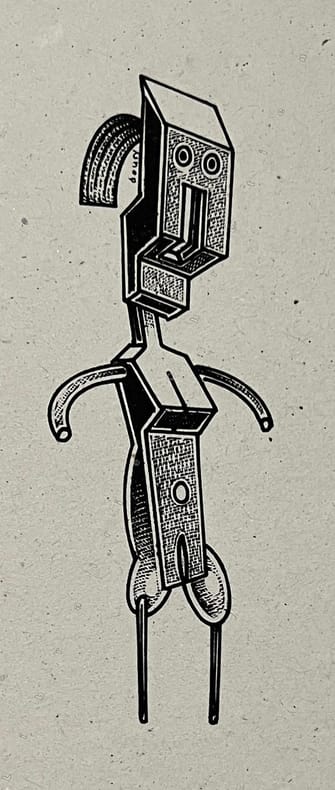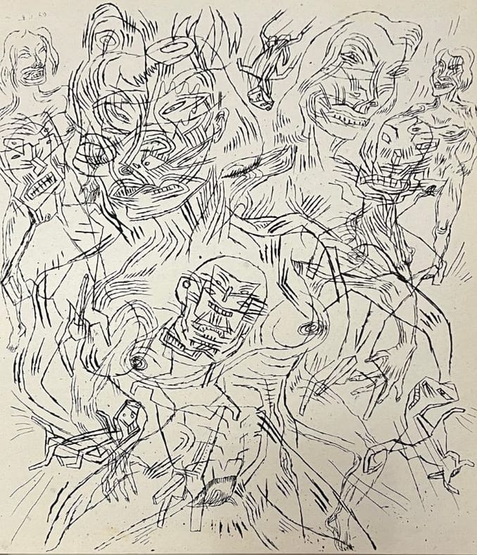 Carnet de dessins de Bruno Richard (Île Maurice, 1956), dessinateur, graphiste et éditeur.. Infime mouillure en pied n'affectant pas le dessin. Élève à L'ENSBA et L'ENSAD il y rencontrera Pascal Doury avec lequel il fonda, en 1977, la revue Elles sont de Sorties, un "graphzine" qu'il dirige seul depuis 1994. Son oeuvre est expérimentale, au carrefour d'influences européennes, japonaises et américaines. Ce recueil graphique (sans aucun texte), au style expressionniste et cru, mêle des figures humaines, presque primitives, dans un jeu d'imbrication. L'espace est saturé, sans perspective, le trait noir est puissant, brutal. Tirage limité à 120 exemplaires. Un des 100 exemplaires numéroté. Exemplaire justifié par l'artiste.