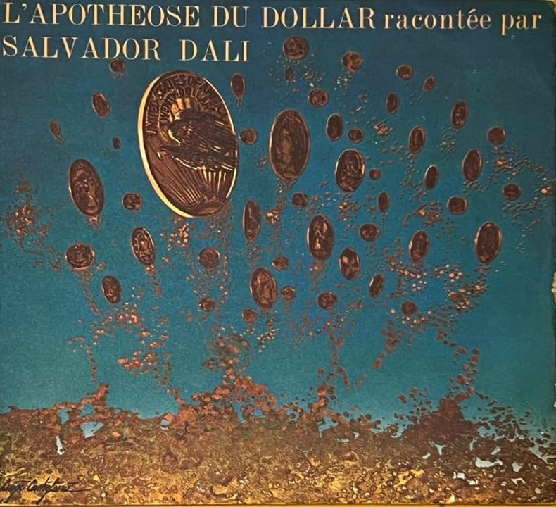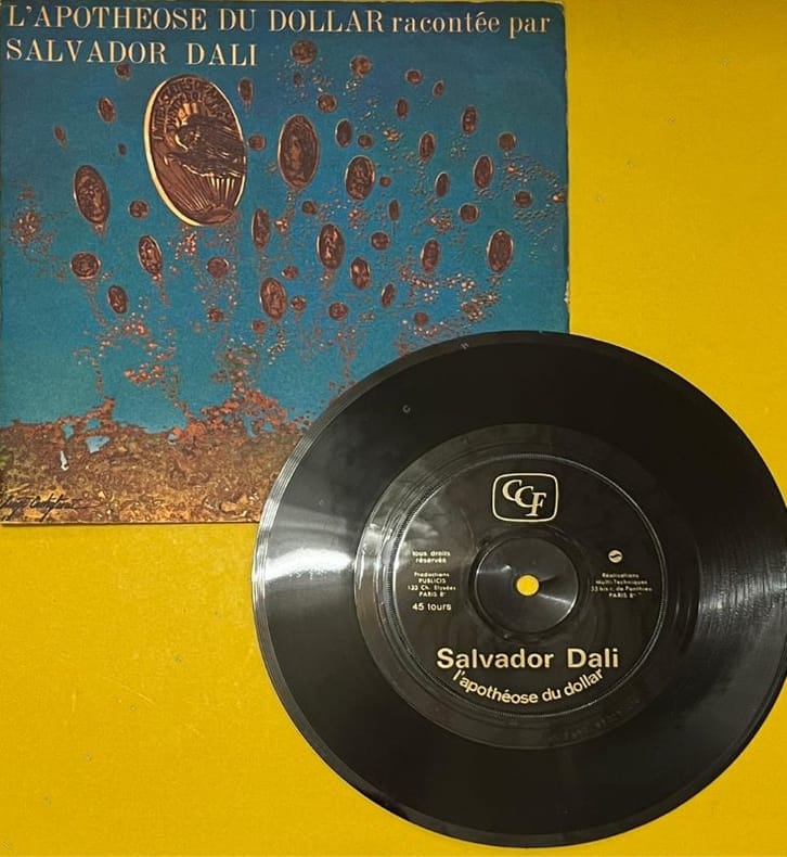 Commande passée par le Crédit Commercial de France au grand Maître du Surréalisme, Salvador Dali. Ce texte onirique, enregistré sur une face, fait référence à une peinture de l'artiste "L'Apothéose du dollar" datant de 1965. Le disque était distribué aux clients de CCF. Infimes usures et salissures à la pochette.