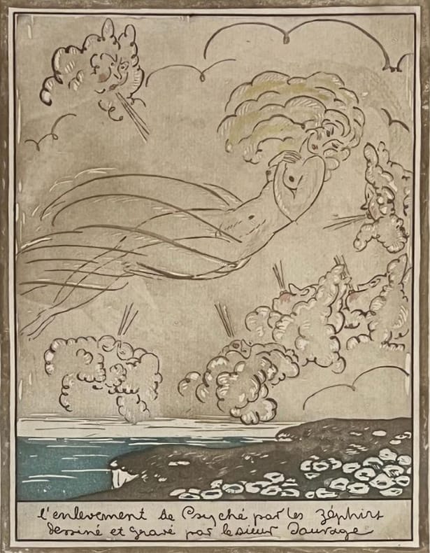 Projet pour La Baïonnette où la rencontre d'une belle échevelée et d'un aviateur. Sylvain Sauvage (Baume-les-Messieurs, Jura, 1888-1948 Paris), de son vrai nom Félix Roy, fut élève aux Beaux Arts. Peintre, graveur, illustrateur et éditeur français. Il débuta dans les années 20 en illustrant des ouvrages pour Kieffer, puis Mornay, Jonquières et Crès, avant de devenir éditeur et collabora à des revues telles que la Gazette du Bon Ton, la Baïonnette ou Fantasio. Il fut le directeur de l'École Estienne dès 1934 et ce, jusquà sa mort. Il exposa au Salon des Artistes Décorateurs. Collection Michel Lagarde - Julien Chaudet. Référencée au catalogue pages 71.