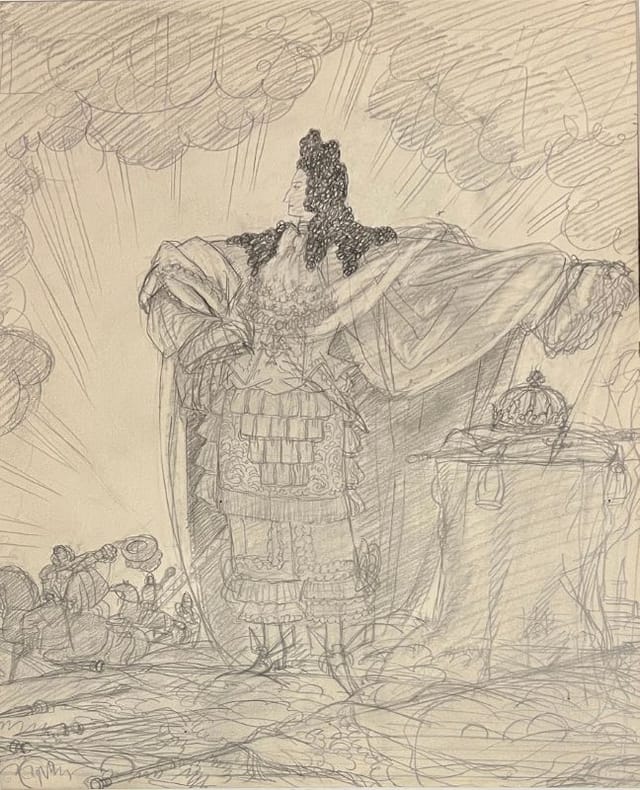 Maquette de l'ouvrage "Louis XIV" de Funck Brentano. Sylvain SAUVAGE (1888-1948), un illustrateur et artisan du livre, qui était exposant au Salon des Artistes décorateurs. (Bénézit, IX, p. 316). Frantz FUNCK-BRETANO (Munsbach 1862 - Montfermeil 1947) est un bibliothécaire et historien français spécialisé sur la période de l'Ancien Régime, il dresse un portrait de Louis XIV, depuis sa petite enfance jusqu'à sa mort, en détaillant les événements qui auront marqué sa vie. Référencée au catalogue page 75.