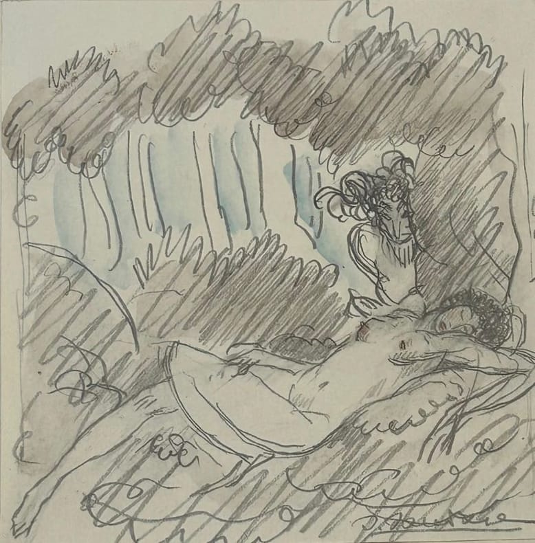 Les 36 figures de cet ouvrage, dont 9 hors-texte, ont été dessinées par Sylvain Sauvage. Elles ont été gravées sur bois et imprimées par Pierre Bouchet. Un des 235 exemplaires sur vergé de Montval. Texte encadré d'un filet rouge, ornements tirés en rouge et noir. Superbes compositions de Sylvain Sauvage dans le plus pur style Art déco. "Belle édition recherchée et cotée", Carteret, t. 4, p. 251. "... Dans toutes ces planches dominent un ton d'ocre pâle, la gravure du trait est tirée dans un gris qui sert aussi à des indications de modelé. Un rose délicat anime les nus de rehauts discrets. Parfois, un vert, un bleu, un rouge, jette une note vive. Mais ce sont les noirs surtout, des noirs profonds, dont l'artiste a su jouer avec une rare maîtrise, qui mettent en valeur et font hanter les harmonies légères de ces charmantes évocations (...) Il nous donne (...) l'image d'une sensualité près de la nature, d'une franchise parée de simple poésie..." (Marcel Valotaire). "Édition de luxe contenant 33 figures dessinées par Sylvain Sauvage, gravées sur bois et imprimées par Pierre Bouchet" (Talvart 321-H). Exemplaire enrichi d'une Lettre autographe de Pierre Louÿs, de 2 dessins à la mine de plomb et aquarellés. Collection et ex-Libris de Claude Chalanson.