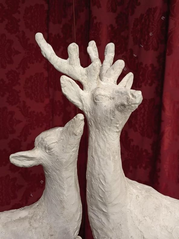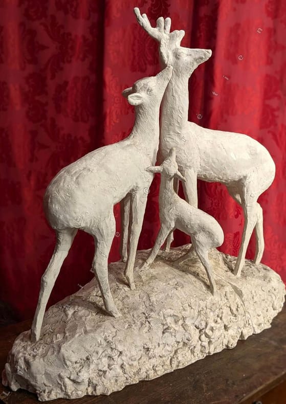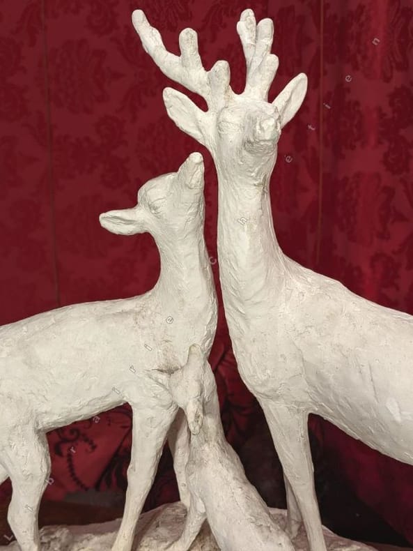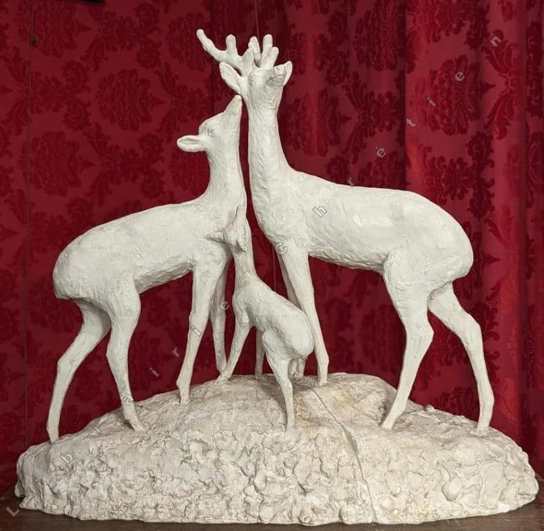 Rémy Hétreau (Patay 1913-2001) réalise des sculptures pour le Salon de l'Imagerie dés 1944. Un ouvrage lui rend hommage "Rémy Hétreau un monde enchanté". Avec son épouse Janine ils firent de nombreuses créations à quatre main comme, peut-être, ce trio "Cerf-biche et faon". Restauration au bois. La Médiathèque Marcel Proust organisa une rétrospective "Hétreau, l'art en héritage".