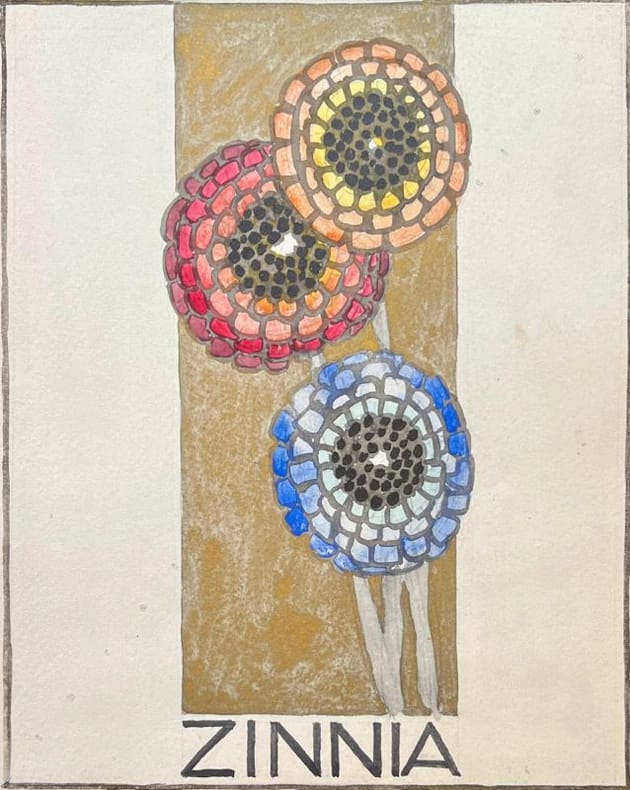 Étude florale Art-déco à 4 mains des époux Roy - Grappe, certainement à l'initiative de Charlotte Grappe-Roy (1890-1930). Les jeunes mariés arrivent au coeur d'une fête artistique et créative initiés dans la Gazette du Bon Ton et culminant en 1925 lors de l'Exposition des Arts Décoratifs. Sylvain Sauvage (Baume-les-Messieurs, Jura, 1888-1948 Paris), de son vrai nom Félix Roy, fut élève aux Beaux Arts. Peintre, graveur, illustrateur et éditeur français. Il débuta dans les années 20 en illustrant des ouvrages pour Kieffer, puis Mornay, Jonquières et Crès, avant de devenir éditeur et collabora à des revues telles que la Gazette du Bon Ton, la Baïonnette ou Fantasio. Il fut le directeur de l'École Estienne dès 1934 et ce, jusqu'à sa mort. Il exposa au Salon des Artistes Décorateurs. Collection Michel Lagarde - Julien Chaudet. Référencée au catalogue Saugier pages 26-31.