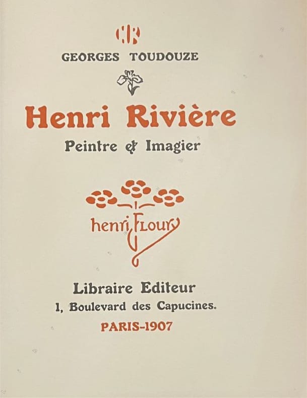 Édition originale, ornée d'un portrait-frontispice lithographié original de Rivière par Steinlen, seulement présent dans les exemplaires de tête. Ouvrage illustré de 145 reproductions d'uvres d'Henri Rivière (1864-1951), dont 42 planches hors texte : 1 héliogravure, 12 planches en 3 couleurs, 28 planches en 2 tons, 103 gravures tirées en camaïeu dans le texte. Couverture, ornementation typographique, lettres ornées, monogrammes, marques, cachets dessinés par Georges Auriol (1863-1938). Mise en page de Henri Rivière. Infimes marques.Tirage limité à 1.100 exemplaires. Un des 100 sur papier grand Vélin de Rives en Dauphiné, in Leroy-Crèvecoeur, 338, Gallica FRBNF43713035.