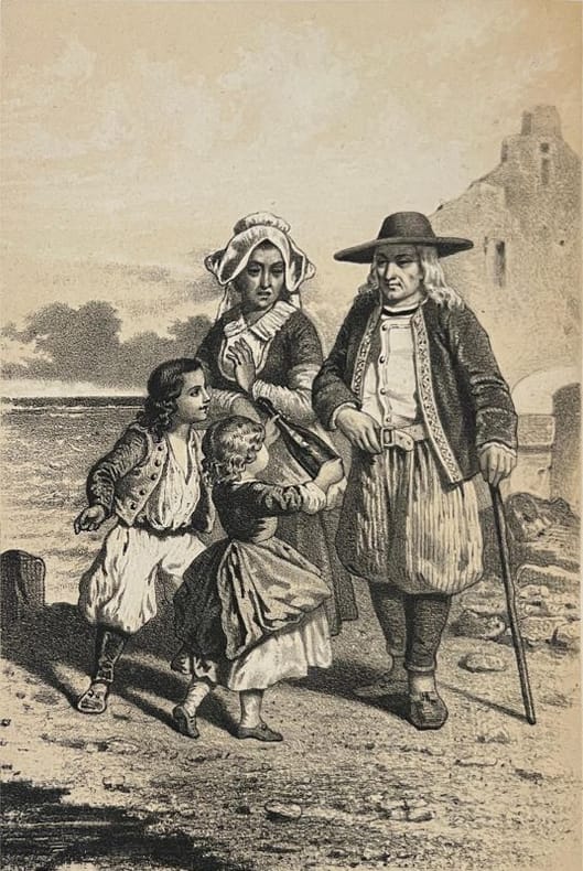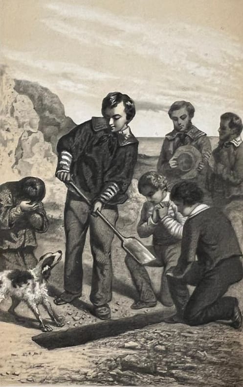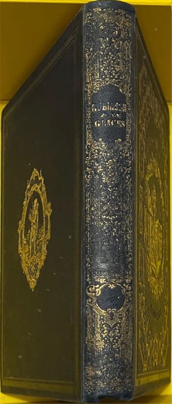 L’AUTEUR : Ernest FOUINET (Nantes, 1799- Paris, 1845), romancier, poète et traducteur de poèmes « orientaux », dont les talents furent reconnus par Hugo et Sainte-Beuve. Il se délassait en écrivant des ouvrages destinés à la jeunesse. L’ILLUSTRATION : Vingt-cinq lettres ornées, à connotation religieuse, en tête de chacun des vingt-cinq chapitres et, hors texte, quatre lithographies à deux teintes, non signées, sous serpente muette. L’ÉDITION : Cet ouvrage figure en bonne place au panthéon littéraire des « Robinsonnades », où il côtoie, entre autres, Johann David Wyss et son Robinson helvète (1812), Jules Verne et les mystères de l’Île (1874), jusqu’à Michel Tournier et ses veilles de Sabbat (1967 et 1971) ; le genre n’est pas encore épuisé. Le livre de Fouinet connut de multiples éditions depuis l’originale (Paris, Eymery, 1835), dédicacée « À la Reine des Français », hommage encore imprimé [en ligne sur google.books] dans l’édition de 1851 (Paris et Limoges, mêmes éditeurs,) ! La Seconde République fut éphémère, mais quand même. Dans notre exemplaire, le chapitre IV « Un mauvais livre » (pp.24-33) , décrit comme suit : un ouvrage « … imprimé il y a quarante ans peut-être [circa 1795] où il était dit que tous les hommes étaient égaux, que l’obéissance passive était flétrissante , et qu’il était du devoir de résister à une volonté injuste », lecture qui conduit le héros du roman a susciter une mutinerie qui échouera lamentablement et le mènera vers l’exil expiatoire. Ce qui est en parfaite adéquation avec l’appartenance de cette œuvre à la « Bibliothèque religieuse, morale, littéraire, pour l’enfance et la jeunesse, publiée avec approbation, etc ». Mais, au cours du temps, quelques retouches posthumes seront apportées : dans l’édition de 1891 (gallica), le chapitre IV a été refondu, le titre a disparu, toute référence au « mauvais livre » de même… Autres temps autres mœurs . En définitive, assez bel exemplaire de ce joli cartonnage qui se rencontre rarement en bon état. GAR (V3 G)