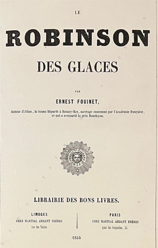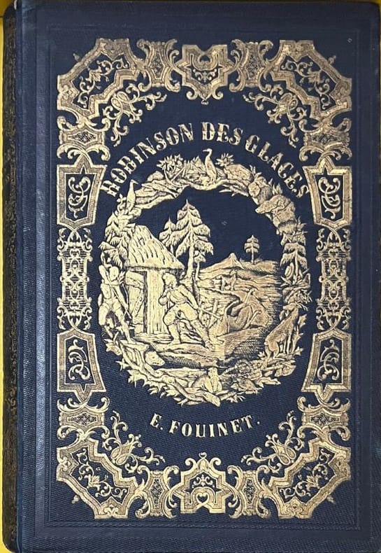 Nouvelle édition illustrée de 4 lithographies en sépia. Texte dans un encadrement. Cartonnage polychrome de l'éditeur en percaline noire. Grande plaque spéciale dorée sur le plat supérieur. Riche encadrement bleu, jaune, rose, blanc. Dos lisse très richement orné de polychromies. Plaque spéciale sur le plat inférieur : Robinson dans un médaillon orné de polychromie. Une mince fente en queue. Un coin émoussé. Quelques cahiers légèrement déboîtés. Bel exemplaire. Récit d'aventure pour la jeunesse. Une robinsonade dans une île de glace. - Photographies et détails sur www.Edition-Originale.com -