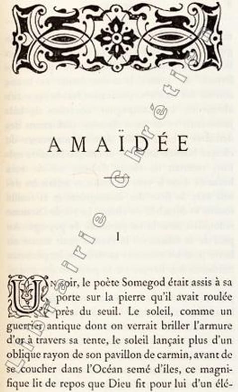 Edition originale. Préface de Paul Bourget, l'auteur se reconnaît dans le personnage d'Altaï, Maurice de Guérin dans celui de Somegod, et Amaïdée, "fille de race déchue", est inspirée d'une aventure réelle de l'auteur, selon ses propres dires. Intéressante oeuvre de jeunesse écrite avant 1840, dont le manuscrit figura à la dispersion de la bibliothèque de Sainte-Beuve où il passa dans les mains d'un certain M. Paradis, puis disparut pour de nombreuses années. Vicaire, Seguin: Etudes de bibliographie critique.