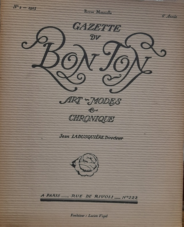 6 planches hors texte (pl. 41 à 46), coloriées au pochoir, de Georges Lepape, Charles Martin, André E. Marty, Thayaht (la somptueuse planche "Japonika"), George Barbier et Roger Chastel, pour des créations de Jeanne Lanvin, Max-A. Leroy, Paul Poiret, Madeleine Vionnet, Worth. Articles illustrés en couleurs: Le Printemps (Julien Ochsé) - L'Art des accessoires, ou les accessoires de l'Art (texte de Marcel Astruc, dessins de Pierre Mourgue) - Les dames en couleurs (Vaudreuil, L'Hom) - Les Livres - Les Romans de la Table Ronde - Les Cannes de Monsieur Bourget (Pierre Lièvre, Marty) - Frivolités (George Barbier, Pierre Brissaud) - Prédictions pour l'été 24 (Célio, Mourgue) - La Chronique de Paris (avec illustrations en couleurs à pleine page de Maurice Van Moppès et Jacques Demachy). Numéro bien complet."La Gazette du Bon Ton "Art, Goût, Beauté" est une revue de mode fondée à Paris en 1912 par Lucien Vogel. Elle a paru jusqu'en 1925, avec une interruption de 1916 à 1920, soit 69 livraisons. Elle comprend 573 planches coloriées au pochoir et 148 croquis représentant des modèles de couturiers. Chaque fascicule constitue un album de luxe, imprimé sur beau papier en Cochin, caractère totalement nouveau à l'époque. De nombreux artistes y ont collaboré : Guy Arnoux, Léon Bakst, George Barbier, Benito, Pierre Brissaud, Boutet de Monvel, Umberto Brunelleschi, Chas Laborde, Jean-Gabriel Domergue, Raoul Dufy, Édouard Halouze, Alexandre Iacovleff, Jean Emile Laboureur, Georges Lepape, Charles Loupot, Charles Martin, André-Edouard Marty Ces artistes, inconnus pour la plupart lorsque Lucien Vogel fait appel à eux, imposeront une nouvelle image de la femme. Ils garderont de leur collaboration à cette revue un socle esthétique commun et exposeront leurs uvres sous le nom de Collaborateurs de la Gazette du bon ton. Les planches représentent les robes des créateurs de l'époque : Lanvin, Doeuillet, Paquin, Poiret, Worth, Vionnet, Doucet. Certaines planches ne figurent aucun modèle réel, mais seulement l'idée que l'illustrateur se fait de la mode du jour. [] La naissance de la Gazette du bon ton est un événement dans l'histoire de l'édition de mode. C'est la première revue qui allie souci esthétique, exigence de beauté et d'unité plastique." (Sources Wikipédia).