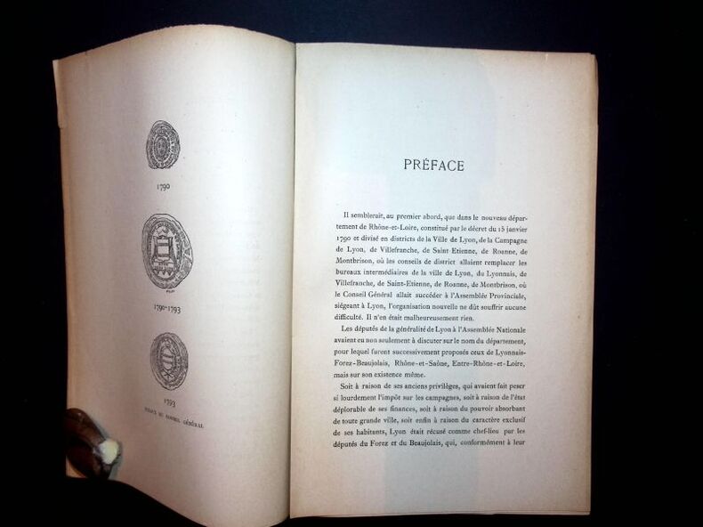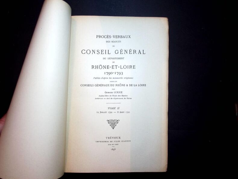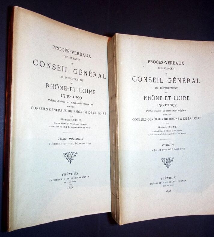 Trévoux, Impr. Jules Jeannin, Trévoux, Impr. Jules Jeannin1895 ; 2 vol., grand in-8, brochés, couvertures imprimées. XXXI pp., 512 pp. - 1 f., 556 pp., 1 f.Document important d’un grand inerèt pour l’histoire de la Révolution à Lyon, Villefranche, Roanne, Saint-Etienne et Montbrison.Joint : une lettre autographe indiquant que cet exemplaire à été offert à M. Viry, ancien Conseiller Général et maire de Noirétable, par le Conseil Général de la Loire sur décision de sa commission départementale du 23 X 1895.Fente de 4 cm. à la couverture du tome II se prolongeant sur les 5 premiers ff. et manque à un coin de la couv.