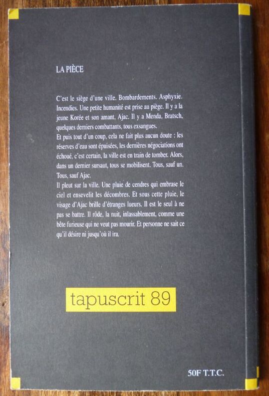 Tapuscrit 89 - collection théâtre ouvert, 1997 - In-8°, broché, sobre titrage noir et blanc sur plats noirs et jaunes, 80 pages, bon exemplaire.
