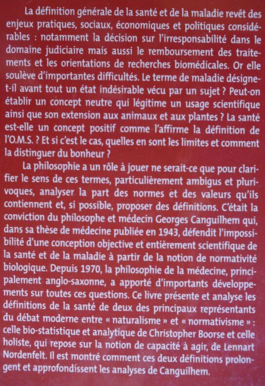 La définition de la santé et de la maladie revêt des enjeux théoriques etpratiques considérables dans les sociétés contemporaines. Or, la philosophie aun rôle à jouer, ne serait-ce que pour clarifier le sens de ces termes, ambiguset plurivoques, analyser la part des normes et des valeurs qu'ils contiennentet, si possible, proposer des définitions. C'était la conviction de GeorgesCanguilhem qui, dans sa thèse publiée en 1943, défendit l'irréductiblenormativité de la santé et de la vie. Depuis 1970, la philosophie de lamédecine, principalement anglo-saxonne, a apporté d'importants et richesdéveloppements. Ce livre présente la théorie analytique et bio-statistique deChristopher Boorse et celle, holiste, qui repose sur la notion de capacité àagir, de Lennart Nordenfelt, en mettant en évidence les liens etapprofondissements qu'elles apportent par rapport aux thèses de Canguilhem.Élodie Giroux est maître de conférences à la faculté de philosophie del'Université Lyon 3. Franco de port France jusqu'à 29 euros iclus. PAYPAL immédiat. MONDIAL RELAY pour : FRANCE, Portugal, Pologne, Espagne, Allemagne, Autriche, Pays Bas, Luxembourg, Italie, Belgique. Toutes les étapes sont accompagnées. Achat, estimations et listages (Papiers, Archives, monographies, arts et métiers, sciences humaines et bibliophilie) France / Suisse (sur rdv).