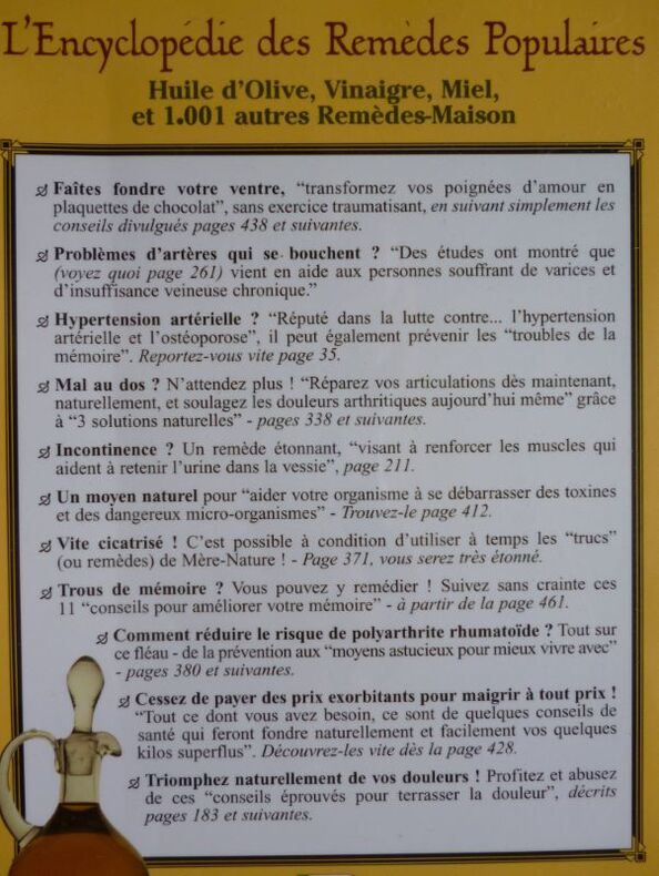 Huile d'Olive, Vinaigre, Miel et 1.001 autres Remèdes-Maison. Traduit par Emmanuelle Nicolas. Classification Dewey : 610-Sciences médicales. Médecine