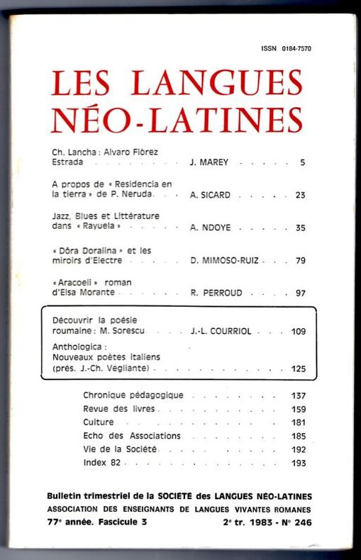 Bulletin trimestriel de La Société des Langues Néo Latines, 2ème Trimestre 1983 - N°246 .In-8°, broché, couverture unie souple titrée en rouge et noir, 208 pages, index in finebel exemplaire.