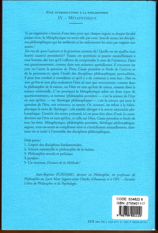 si un organisme a besoin d'une âme pour que chaque organe et chaque faculté puisse vivre, la métaphysique ne serait-elle pas cette " âme " de toutes les disciplines philosophiques qui les unifierait et les ordonnerait les unes par rapport aux autres ? en vue de quoi l'univers et la personne existent-ilsoe quelle est ou quelles sont leur(s) cause(s) première(s) ? toutes ces questions se posent naturellement à tout homme dès lors qu'il s'efforce de comprendre le sens de l'existence. Dans son questionnement, comme dans son existence quotidienne, il rencontre un jour ou l'autre la question de dieu, cause première et finale de l'univers et de la personne et, après l'étude des disciplines philosophiques particulières, il peut être conduit à considérer ce qu'il y a de commun à tout être : l'être en tant qu'être et non plus seulement l'être en tant que mouvement, comme dans la philosophie de la nature, ou l'être en tant qu'être de raison, comme dans la science rationnelle.C'est pourquoi la métaphysique selon ces deux types de questionnements se nomme " philosophie première " - c'est la science de l'être en tant qu'être - ou " théologie philosophique " - c'est la science qui pose la question de dieu, son existence, sa nature. or souvent on refuse à la méta-physique le nom de " théologie " : cela semble déroger à la stricte rationalité philosophique. l'intérêt des textes présentés ici est peut-être alors d'unir la considération sur l'être en tant qu'être, et celle sur dieu, cause première et finale de tous les êtres. Métaphysique, philosophie première, théologie philosophique, sagesse, tous ces noms se complètent ainsi et s'enrichissent mutuellement, donnant vie et unité à l'ensemble des disciplines philosophiques. - Très bon état - Franco de port France jusqu'à 29 euros iclus. PAYPAL immédiat. MONDIAL RELAY pour : FRANCE, Portugal, Pologne, Espagne, Allemagne, Autriche, Pays Bas, Luxembourg, Italie, Belgique. Toutes les étapes sont accompagnées. Achat, estimations et listages (Papiers, Archives, monographies, arts et métiers, sciences humaines et bibliophilie) France / Suisse (sur rdv).