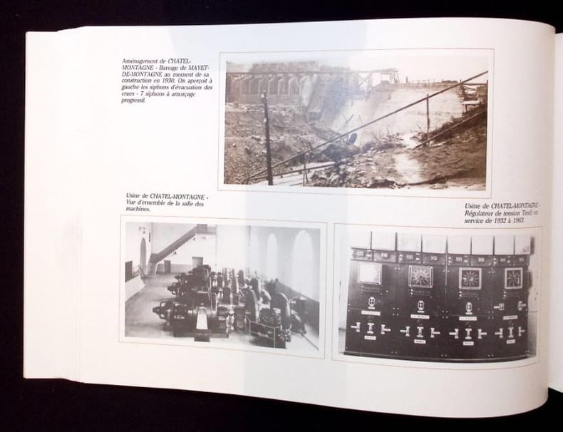 Electricité de France, Service de la Production Hydraulique, 1987 - In-4° à l'italienne ( 18,8 x 27 de large ). Broché, couverture souple glacée chocolat illustrée au centre et titrée en noir et blanc, très importante iconographie dans le texte en noir ( photographies d'hommes, d'ouvrages, de turbines, d'usines ) pour ce catalogue raisonné de 212 pages, en très belle condition.