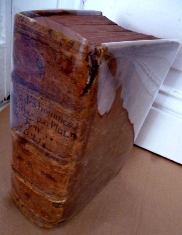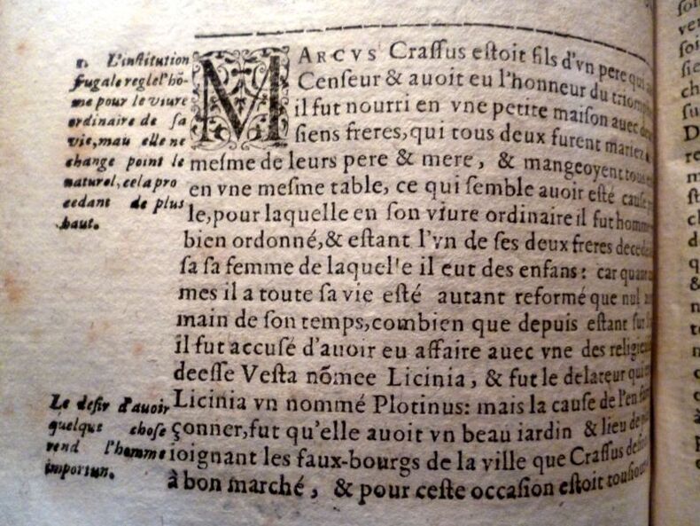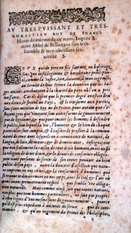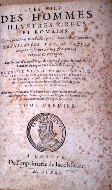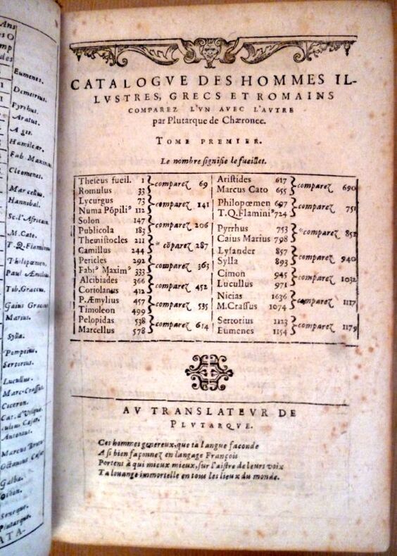 A Genève, De l'imprimerie de Jacob Stoer, 1621 - Ford volume dans sa reliure d'époque comportant : Page de titre ornée d'un monogramme en médaillon représentant Plutarque, 2ff - remerciement "au très puissant et très chrétien roy de France Henri deuxième de ce nom (...)" - " Aux lecteurs" 8ff - Indice chronologique ( " ov brief discovrs des temps esquels ont vescv les hommes illustres dont les noms font contenus en ceft oeuure " )4ff - Catalogue des hommes illustres grecs et romains comparez l'un avec l'avtre par Plutarque (...) 1f - Les vies des hommes illustres Grecs et Romainqs comparées l'une avec l'autre par Plutarque (...) THESEVS. 32pp - ROMVLVS 36 pp - La comparaison de THESEVS AVEC ROMULUS 4pp - LYCVRGVS, 40 PP 6 - NVMA POMPILIVS, 35pp - SOLON, 36pp - PVBLIVS VALERIVS 28pp - THEMISTOCLES 34pp - FVRICVS CAMILLVS 54pp - - PERICLES 43pp- FABIVS MAXIMVS34 pp - ALCIBIADES 45 pp - GAIVS MARTIVS CORIOLANVS 48 pp - PAVLUS AMYLIVS 43pp - TIMOLEON 39pp - PELOPIDAS 40pp-MARCELLVS 40pp - ARISTIDES 38 pp - marcvs cato le censevr43 pp - PILOOEOMEN 26 pp - TITVS QVINTIVS FLAMINIVS 29 pp - PYRRVS 46pp - CAIVS MARIVS 61pp - LYSANDER 38pp - SYLLA 48pp - CIMON 27 pp - LVCVLVS 60pp - LVCVLVS lA COMPARAISON DE LVCVLVS AVEC CIMON 4pp - NICIAS 39pp - MARCVS CRASSVS 44 pp - La comparaison de MARCVS CRASSVS ave NICIAS6 pp - SERTORIVS 31 pp - EVMENES 28 PP 6 in du premier volume (1181 ) - Premier indice sur le premier tome 3PP - Second indice sur le premier Tome 2pp - Troisième """" 3pp - Quatrième et dernier indice très ample des noms, matières & chofes notables contenues en toutes les vies de Plutarque 37PP - FIN + 3FF - Ensemble sur deux colonnes comprenant de nombreuses mentions marginales ( voirs clichés ) *** ETAT VOIR VISUEL ET COMMENTAIRES ( clichés complémentaires sur demande)