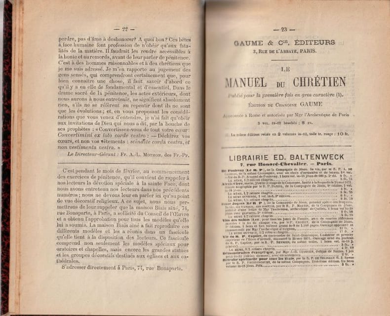 Réunion atypique mais nonobstant cohérente abordant notamment le symbolisme de La Croix. Ultramontainet vulgarisateur dans l'âme, le Chanoine Gaume est l'auteur de nombreux ouvrages, pour la plupart parus chez ses frères, éditeurs à Paris, concernant lathéologie, l'histoireet l'éducation. Ceux de la première catégorie furent longtemps estimés, ceux de la deuxième sont tombés dans l'oubli. ceux de la troisième catégorie ont soulevé la polémique des classiques dans l'enseignement religieux. Belle réunion exempt de rousseur dans une réliure agréable et non épidermée - Quelques manques en bords de plats, coins agréable et bel aspect général. Franco de port France jusqu'à 30 euros. MONDIAL RELAY privilégié et pays suivants desservis : Portugal, Pologne, Espagne, Allemagne, Autriche, Pays Bas, Luxembourg, Italie, Belgique. Toutes les étapes de votre achat sont accompagnées. Achat, estimations et listages France / Suisse (sur rdv).