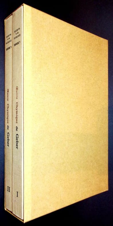 Guy Trédaniel Paris 1976 2 volumes in-8 de 246 et 184 pages, brochés, sous couvertures imprimées et étui Introduction de Charles-Gustave Burg. Texte de l'oeuvre alchimique majeure de Geber, établi d'après la rarissime anthologie de textes hermétiques, publiée une première fois par Salmon en 1672 et 1678 et enrichie par Richebourg en 1741. Transcription en français moderne de La Somme de Perfection ou l'abrégé du Magistère Parfait. Petit ex-dono manuscrit sur une page de garde. Très beaux exemplaires.