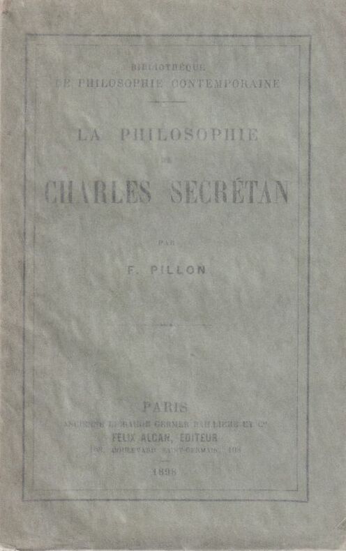 Edition originale. Disciple et collaborateur de Renouvier, F. Pillon donne un exposé fidèle de la doctrine du théologien protestant et philosophe suisse Charles Secrétan, suivi d'un examen critique, en particulier de sa tentative de synthèse religieuse.Disciple de Friedrich Schelling, d'Alexandre Vinet, influencé par Jules Lequier, Secrétan fut lui-même l'ami de Charles Renouvier.L'une des rares études d'ensemble sur Charles Secrétan.Bon exemplaire.