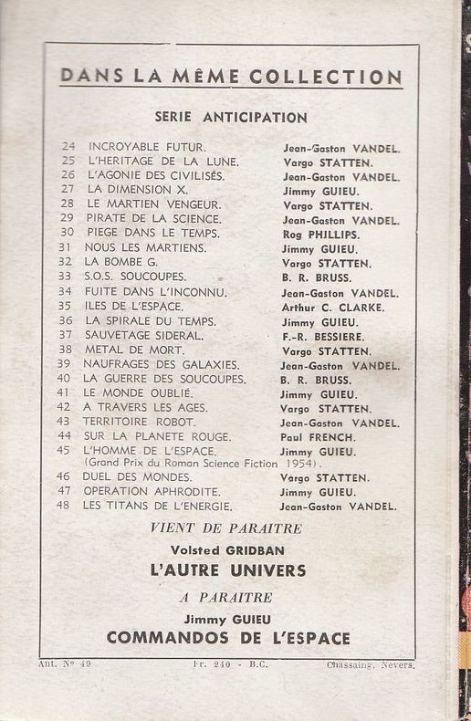 Editions Fleuve Noir, Collection " Anticipation " 1955 . Broché illustré ( couverture de René Brantonne ), format 12.8 x 19 cm, N° 49 de cette collection. Tout petits frottements Tenue bien carrée. Coins inférieur un peu frotté ; frottement en bord de plat. Très belle tranche. Très propre y compris au second plat . Bel exemplaire.