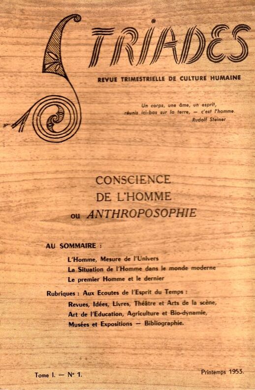 Triades Tome I n° 1 - Printemps 1953. Volume au format in octavo, couverture imitant les veines d'un bois clair, dos plat, second plat muet, 112 pages. Très bon état à neuf.