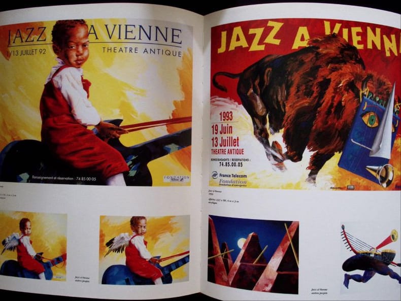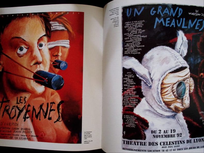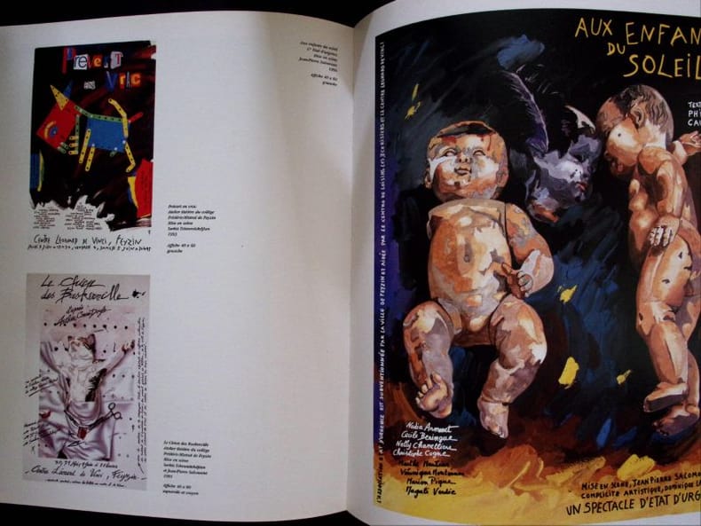 Bron, Imprimerie Sézanne, 1996. Reliure polychrome in quarto robuste, gardes noires mat, environ 200 reproductions d'affiches à pleine page souvent, et en vignettes, sur quatre volets dépliants...Remarquable travail à la fois dans la mise en page que dans la fidélité chromatique. Bel exemplaire.
