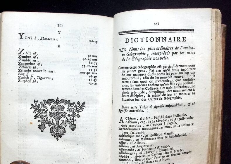 Lyon, Amable Le Roy 1783 In-12, pleine basane racinée, dos à nerfs ornés de filets dorés, caissons ornés de motifs dorés, 6- 346- 24 pp. 17 cartes repliées Robert de Vaugondy. Coins émoussés, coiffe de tête usée. Bon exemplaire.