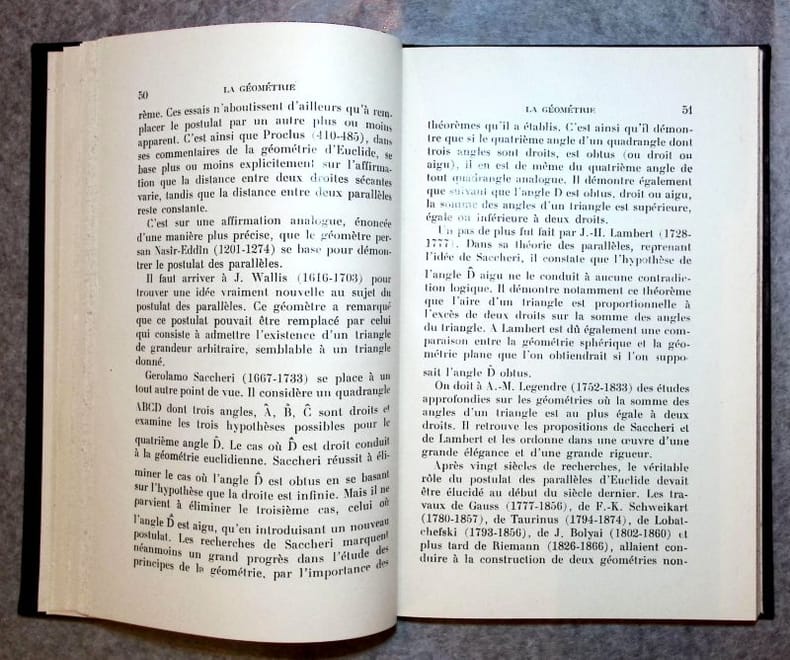 78 figures dans le texte en noir Nouveau tirage chez Blanchard, 1967 (la première édition est paru chez Kundig à Genève) "Contents, Chapitres : Préface - L'espace lobatschewskien, la géométrie lobatschewskienne - Des lignes trigonométriques hyperboliques - Théorie de M. Gérard, relation fondamentale entre les côtés et l'un des angles d'un triangle - Formules relatives aux triangles quelconques, formules relatives aux triangles rectangles - Des parallèles et de l'angle du parallélisme, de l'horicycle et de l'unité naturelle de longueur, de l'hypercycle - Des quadrilatères trirectangles, constructions géométriques élémentaires - Limites de la géométrie lobatschewskienne, de la non existence de la similitude, des aires planes, limites des aires planes - Surfaces des corps ronds, théorème sur les intégrales correspondantes aux volumes, volumes des corps ronds, limites des surfaces et des volumes des corps ronds, conclusion - Selon Jean Itard, cet ouvrage est une ""bonne exposition de la géométrie plane de Lobatschewski"", il explique que David Hilbert a présenté dans un célèbre ouvrage les axiomes qui sont à la base de la géométrie euclienne, et que Lobatchewski acceptent tous ces axiomes sauf celui des parallèles - Grâce aux Mémoires de l'université de Kazan, Lobatchevski a l'occasion d'expliquer les procédés et calculs qu'il a réalisés. Après plusieurs publications en russe, Lobatchevski publie en français en 1837 l'article Géométrie imaginaire dans lequel il présente une géométrie non euclidienne, appelée géométrie hyperbolique, avec comme point de départ non pas une axiomatique, mais un ensemble de formules trigonométriques dans lesquelles le rayon de la sphère est un nombre imaginairen. Il applique ensuite cette géométrie à des calculs d'intégrales définies pour déterminer le volume de certains corps solides. (source : Wikipedia)" dos à peine insolé, la couverture est sinon en très bon état, bords des plats à peine jaunis, intérieur frais et propre, papier à peine jauni, légère petite tache dans la marge de deux pages en début d'ouvrage, infime petit manque de papier dans la marge d'une page de la table en fin d'ouvrage sans manque de texte, cela reste un bon exemplaire de cet ouvrage de référence sur les travaux de Nicolas Lobatcheski à l'instar de l'ouvrage de Barbarien sur la géométrie non euclidienne paru dans les années 1910