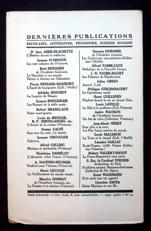 Plon, 1942 (mention de 13ème ed.). In-12° couronne, cousu, 231 pp. (1), bel exemplaire et tenue carrée, dans une pagination uniformément jaunie exempte de rousseurs. CF / Scan de la Table des Matières.