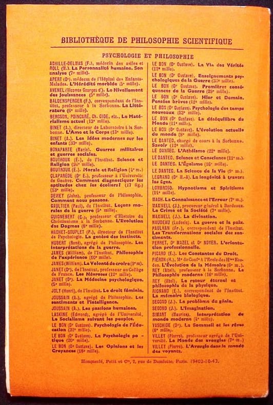Flammarion, Bibliothèque de philosophie scientifique, 1943. In-12°, br. couverture orangée de la collection, 243 pp., (1). Agréable volume, tenue bien carrée et sans rousseurs, tampons de bibliothèque cpdt en p. de fx titre.