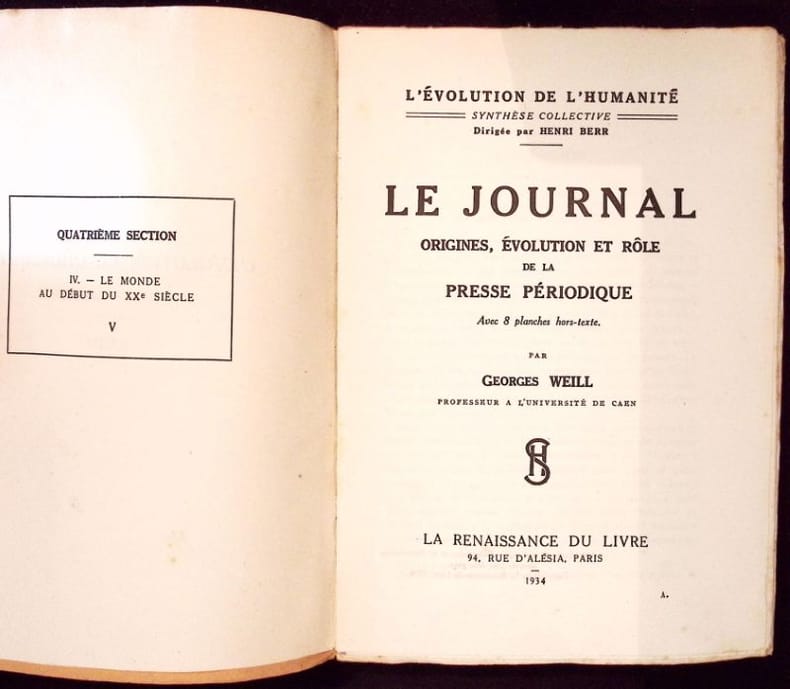 "L'admirable sujet que l'histoire du journal ! Témoin, comme le livre l'avait été au XVIe siècle d'une révolution dans la conscience religieuse, d'une autre révolution dans la mentalité politique à la fin du XVIIIe siècle, la presse périodique est une des manifestations les plus puissantes de la vie sociale. Née pour satisfaire au simple besoin de curiosité, elle a fini par prendre la direction de l'opinion publique et peut-être de la société entière. (...) M. Georges Weill a brillamment accompli la tâche difficile de présenter un aperçu relativement détaillé de l'histoire de la presse dans les quatre principaux pays : la France, l'Angleterre, l'Allemagne et les Etats-Unis. ... Il envisage successivement trois périodes : l'une allant de 1815 à 1848, la deuxième jusqu'au début du XXe siècle, la troisième englobant la guerre et l'après guerre." (Paul Harsin)