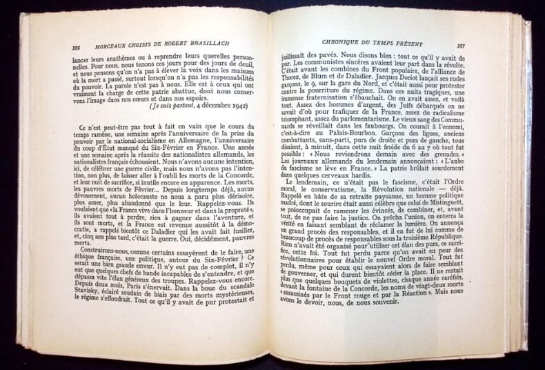 Edition originale, un des 50 exemplaires de tête, nominatif et numéroté sur vergé à la forme et filigrané "1887 BCL". Ce choix de textes de Brasillach a été fait par l'historienne Marie-Madeleine Martin, proche de l'Action Française et de Maurras.