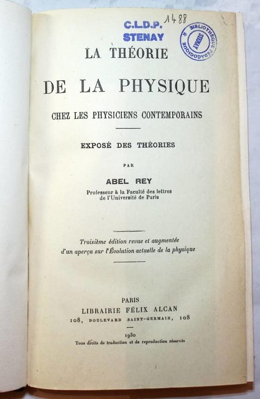 La théorie de la physique chez les physiciens contemporains. Exposé des théories » est un ouvrage dAbel Rey, historien et philosophe des sciences français, publié dabord en 1907 chez Félix Alcan dans la « Bibliothèque de philosophie contemporaine ». Il y présente et discute de façon systématique les grandes théories physiques de la fin du XIX et du début du XX siècle (mécanisme classique, théorie cinétique, thermodynamique, électromagnétisme, débuts de la physique « énergétique ») en insistant sur leurs principes, leurs hypothèses et leur portée philosophique". Franco de port France jusqu'à 29 euros iclus. MONDIAL RELAY pour : FRANCE, Portugal, Pologne, Espagne, Allemagne, Autriche, Pays Bas, Luxembourg, Italie, Belgique. Toutes les étapes sont accompagnées. Achat, estimations et listages France / Suisse (sur rdv).